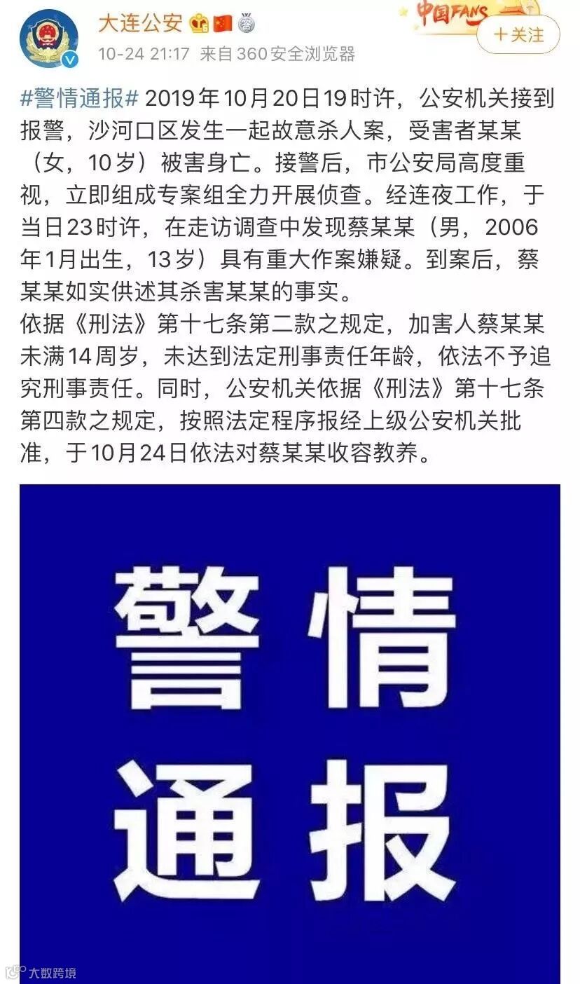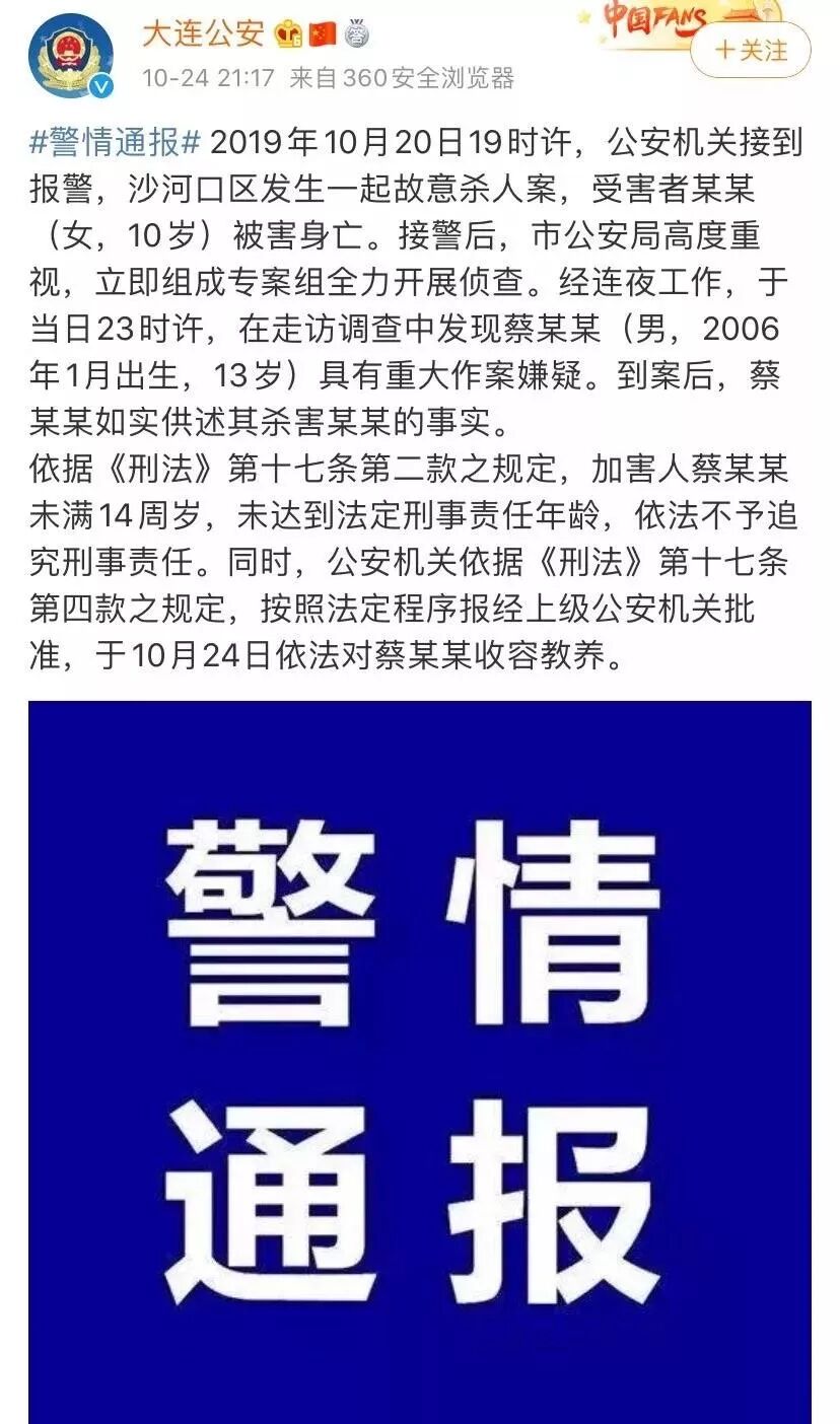 据@大连公安 24日通报,2019年10月20日19时许,公安机关接到报警,沙河口区发生一起故意杀人案,受害者某某(女,10岁)被害身亡。接警后,市公安局经连夜工作,于当日23时许,在走访调查中发现蔡某某(男,2006年1月出生,13岁)具有重大作案嫌疑。到案后,蔡某某如实供述其杀害某某的事实。