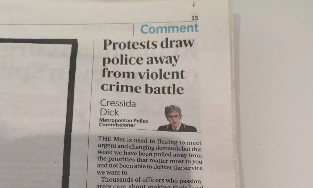 那英国警方是怎么对待这个“香港式”的违法抗议示威的呢?伦敦警察局长克雷茜达·迪克(Cressida Dick)前几天在《旗帜晚报》发表了文章,犀利揭露了违法示威者的策略动机,介绍了警方如何坚决重拳出击,维护社会秩序。文章虽然不乏善意和幽默,但是逻辑缜密,态度鲜明!