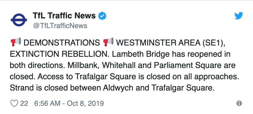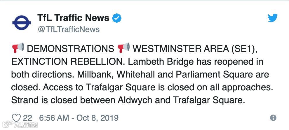 伦敦地铁当局10月8日一条推特就开门见山地通知:“威斯敏斯特区有‘反抗灭绝’。”