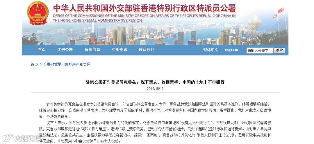 针对美参议员克鲁兹在港发表的极端荒谬言论,外交部驻港公署发言人13日表示,克鲁兹睁着眼睛说瞎话,昧着良心搞破坏,公然来港作秀表演,为极端暴力分子摇旗呐喊、撑腰打气(told blatant lies without conscience, staged political shows in Hong Kong, acted as a cheerleader for the violent extremists)。