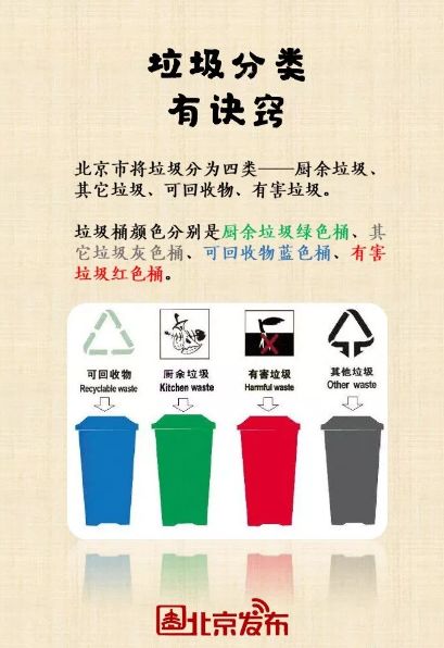 北京生活垃圾采取了“四分法”,共分为厨余垃圾(餐厨垃圾 kitchen waste)、可回收物(recyclables)、有害垃圾(hazardous waste)、其他垃圾(other waste)。