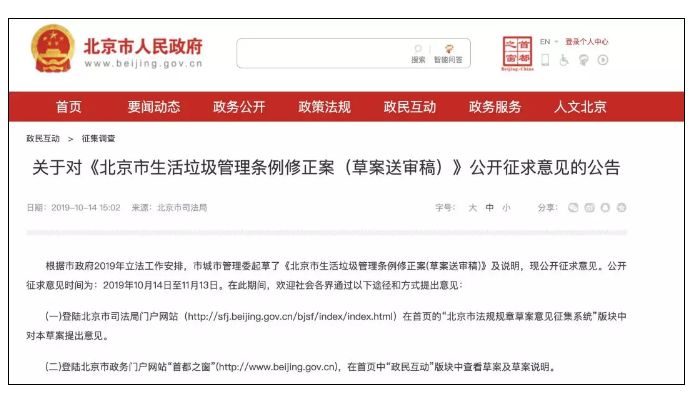 10月14日,《北京市生活垃圾管理条例修正案(草案送审稿)》在首都之窗网上公开征求意见,时间截止到11月13日。