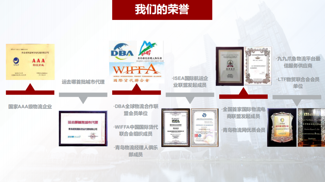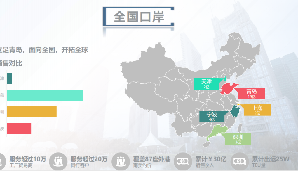 秉持“以信息化为核心、以人为本、以客户为先、以服务社会为己任”的发展理念,从主要提供单一的海运运输服务,到发展以解决客户需求为出发点的综合性现代物流,从青岛单一口岸成为服务网络覆盖全国主要口岸,一站式全程物流解决方案的值得客户信赖的物流企业。