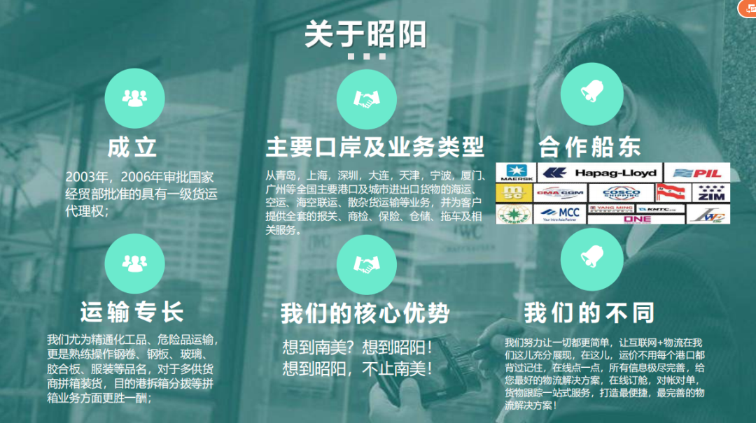 昭阳与世界主力船东签有合约,覆盖全国口岸,可承接从青岛、上海、深圳、大连、天津、宁波、广州等全国主要港口的业务;