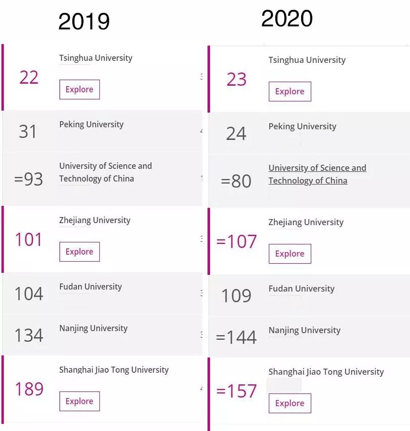 几所中国内地(大陆)学校排名有所下滑,例如南京大学掉落10位位列144名,浙江大学下降六名至107名。