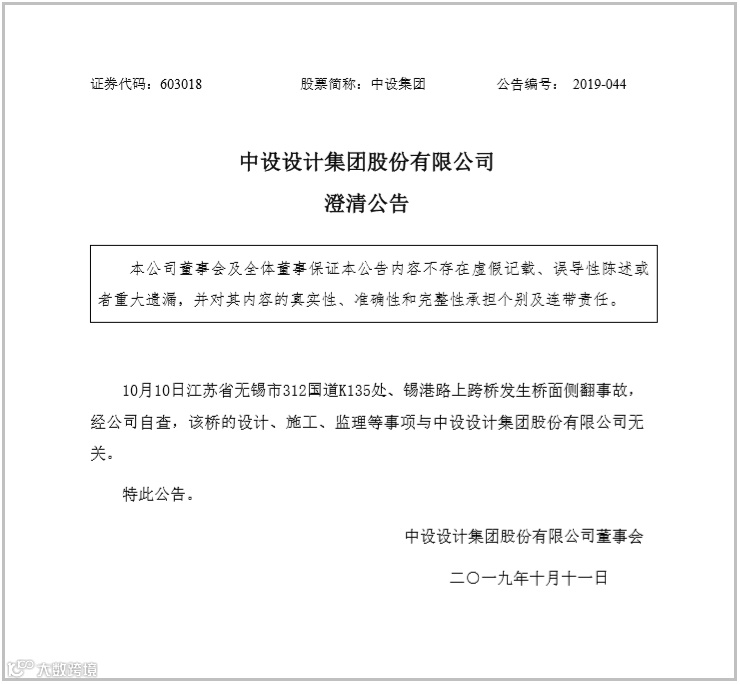 据中新网报道,中设集团11日早间发布澄清公告称,10月10日江苏省无锡市312国道K135处、锡港路上跨桥发生桥面侧翻事故, 经公司自查,该桥的设计、施工、监理等事项与中设设计集团股份有限公司无关。