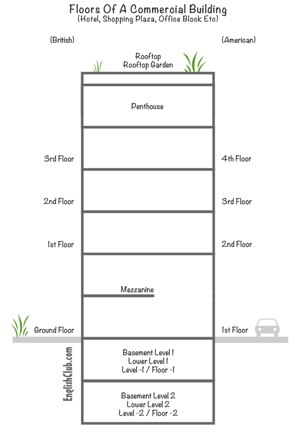 下面这张图把楼层的英文表达总结得比较清楚。注意,左边是英式英语(British English),右边是美式英语(American English),中间是相同的英语: