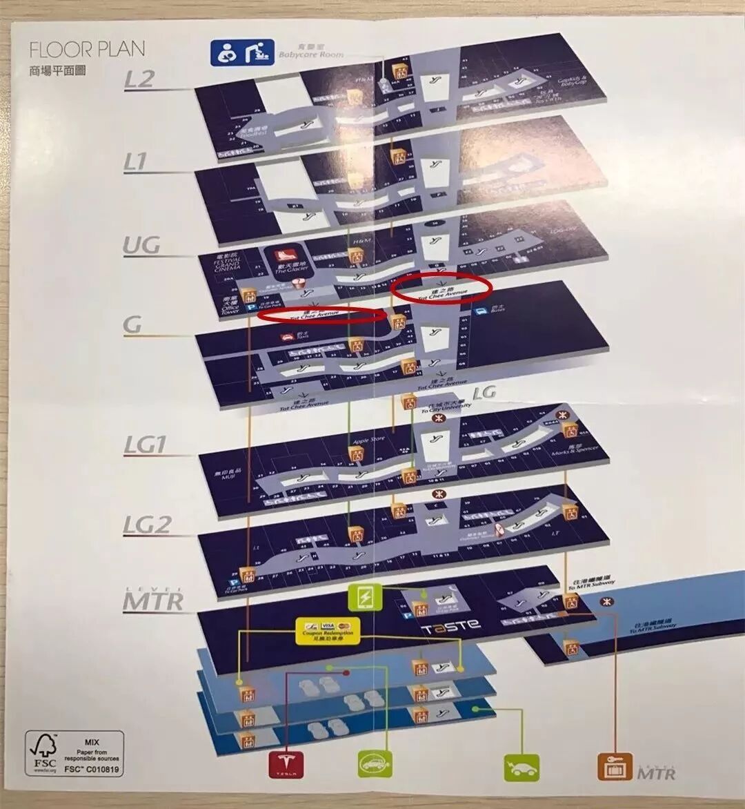 再看“又一城”的地下部分,LG1 和 LG2前面我们说过,表示“地下一层”和“地下二层”(仍是商场),最下面的 MTR 是“港铁”,即地铁层。