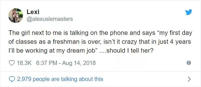 我旁边的这个女生正在讲电话,她说:“我作为大学新生的第一天课结束了,想到再过四年我就可以做自己梦想的工作了,我好激动”……我该告诉她真相吗?