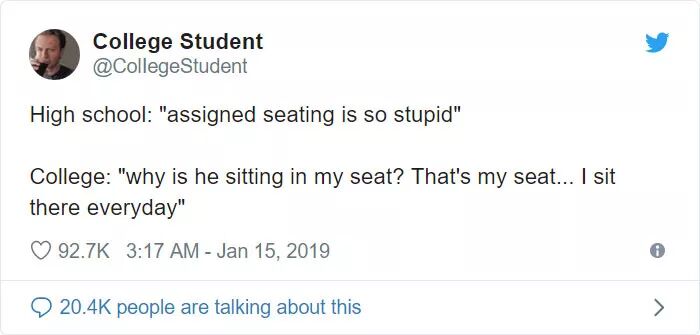 大学时:“为什么他坐在我的位子上?那是我的座位……我每天都坐在那里。”
