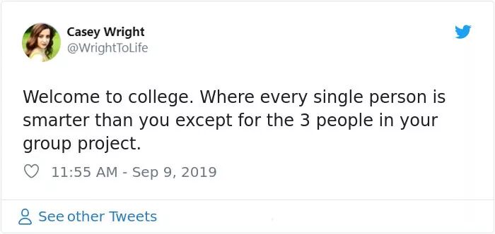 欢迎来到大学。这里的每个人都比你聪明,除了你项目小组里的那三个人。