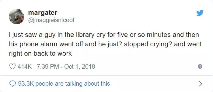 我刚看见一个男生在图书馆里哭了五分钟,然后他的手机提示音响了,他立刻停止哭泣,继续用功学习。