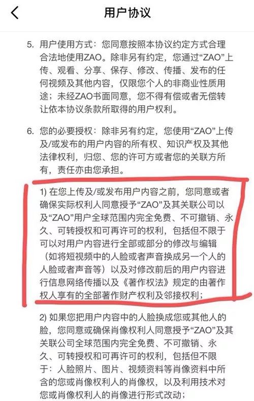 8月31日晚,“ZAO”修改了此前的用户协议,删除了原有的上传肖像权可被“完全免费、不可撤销、永久、可转授权和可再许可的权利”等文字,用“您同意或确保肖像权利人已经同意授予‘ZAO’使用‘ZAO’的技术服务对您的或其他人的人脸进行处理,但仅为与用户内容合成为新的内容”取而代之。