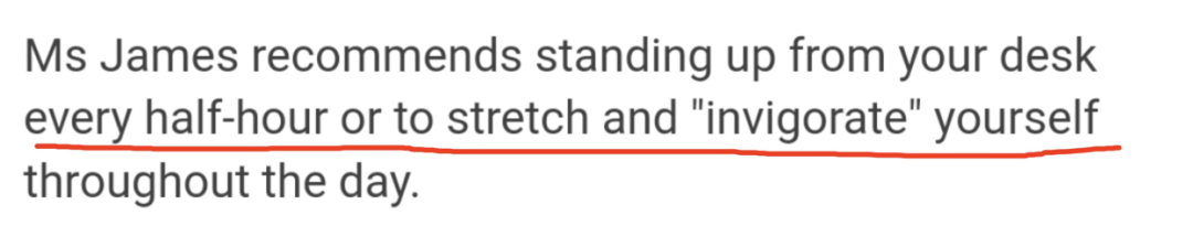 具体就是——但凡工作时间内,你最好每隔半小时就从座椅上站起来,然后伸伸腿活动活动,好让自己恢复活力。