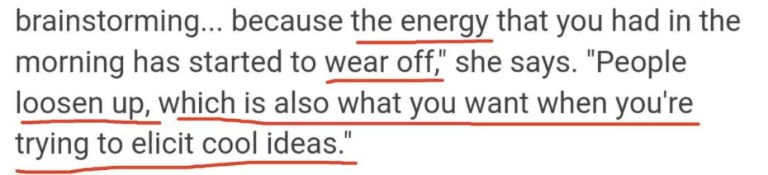 就因为这时候,精力下降,整个人处在松弛慵懒的状态,而“头脑风暴”偏偏又是会议类型中比较松弛的那种,这时候来开会,特别有利于你脱口而出一些帅气的想法。