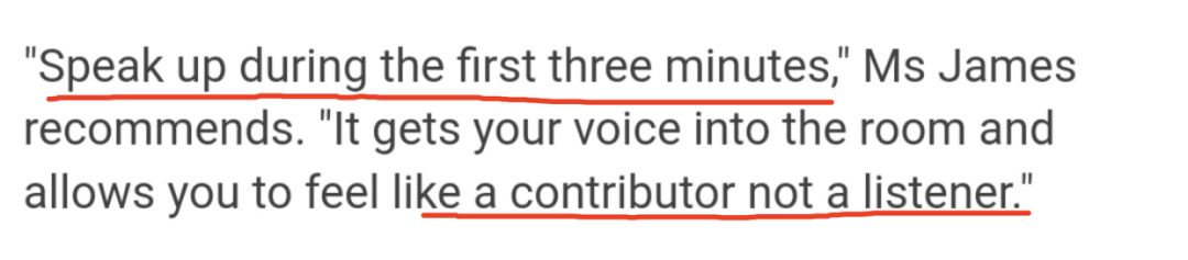 尤其把握开会的头三分钟,尽可能在前三分钟就发一次言,因为这种发言会让你觉得,你是这场会议的贡献者,而不仅仅是带耳朵来的倾听者。