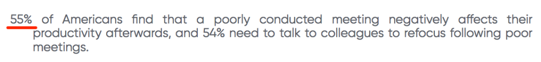这份最新的研究发现,过半美国人(55%)表示,一个糟糕的会议会影响他们之后的工作成果。而且,有过半数受访者还表示,这些不靠谱的会开完过后,他们还需要跟同事重新讨论确定工作的焦点。