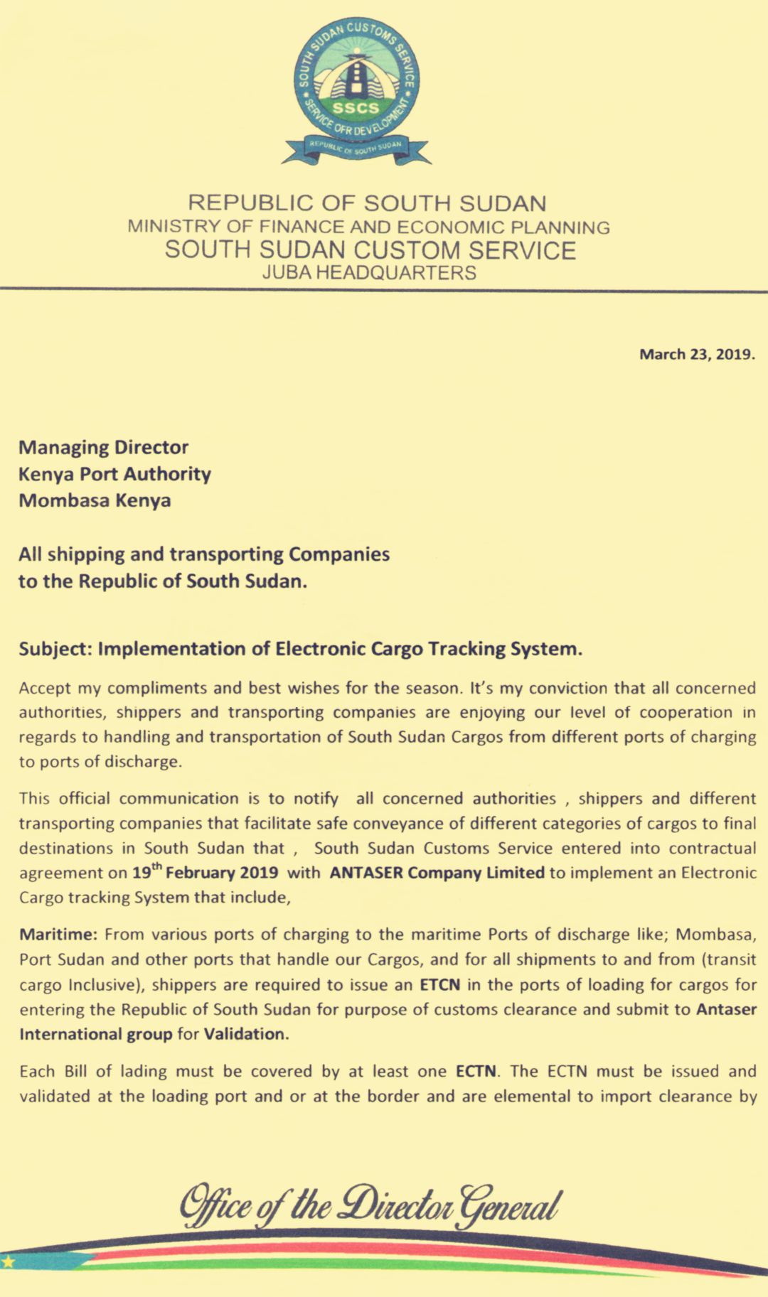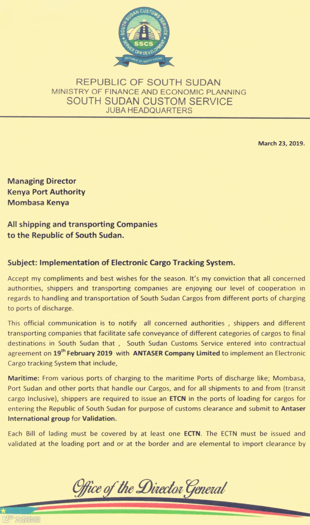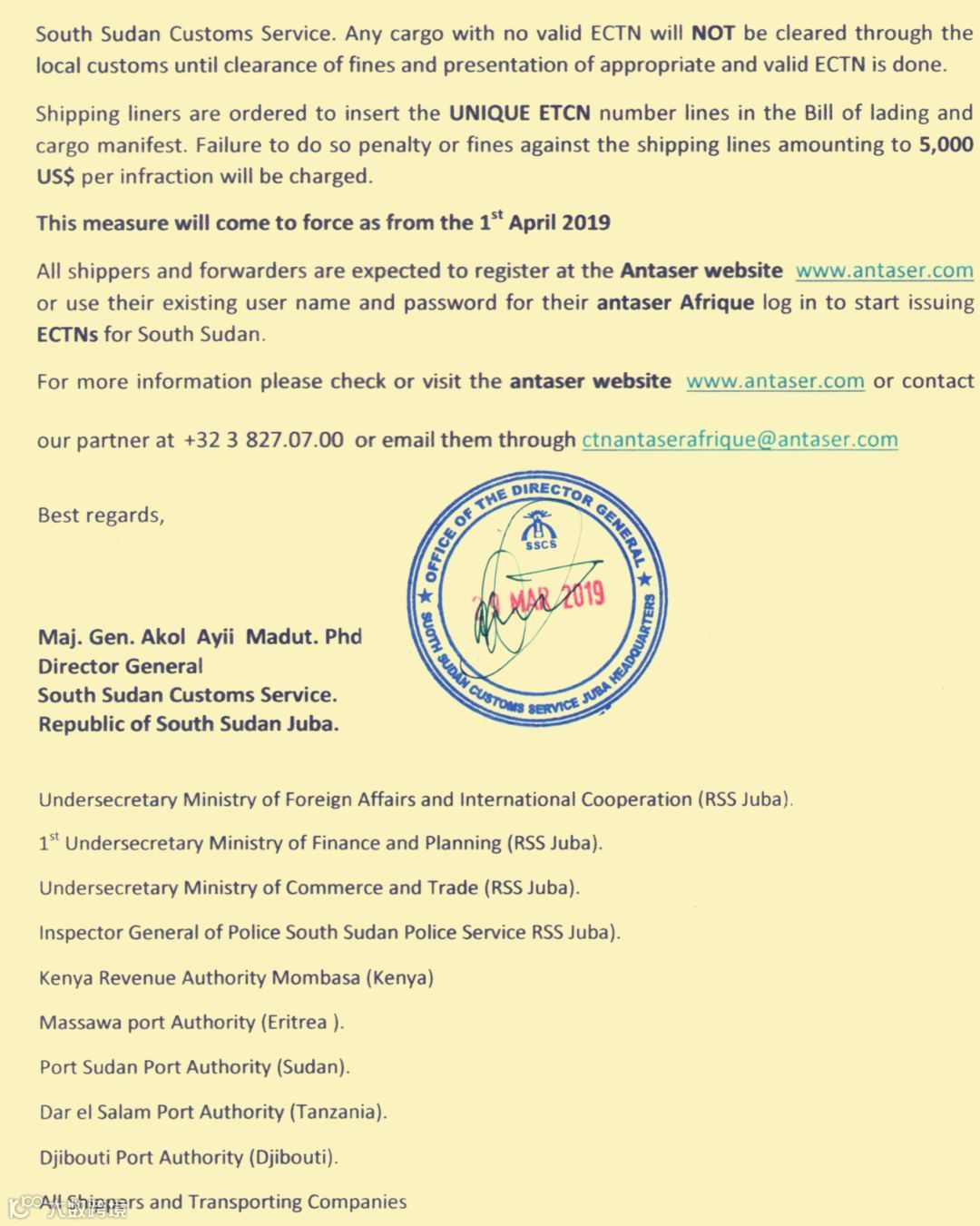 根据所附通函,从提单日期2019年4月1日开始,南苏丹海关管理局对所有进口货物开始实施强制办理电子货物跟踪单 (Electronic Cargo Tracking Note “ECTN”) 的监管。请确保完全符合通函中规定的要求,并提供有关提单和舱单的装运说明及强制性ECTN号码。 否则,海关罚款和清关延误将由托运人承担。