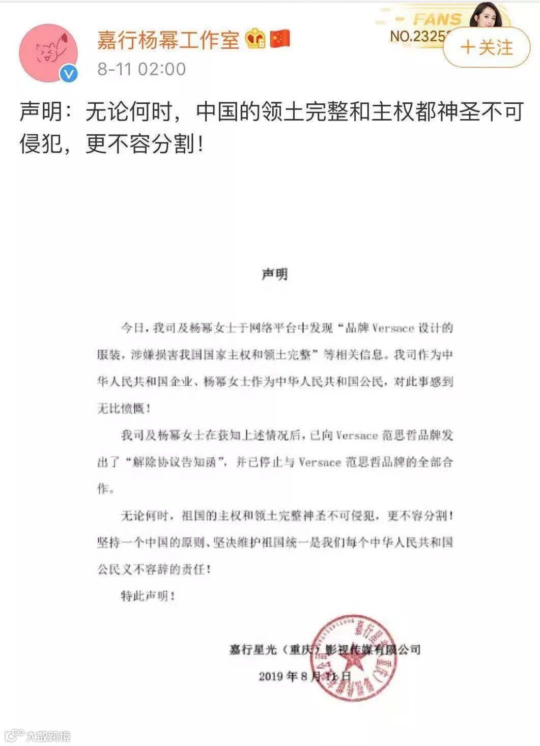The announcement said Yang sent a notification to Versace to cancel the contract with the brand and had stopped all cooperation.
