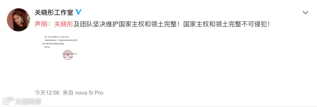 "China's territorial integrity and sovereignty are sacred and inviolable at all times," a statement from her studio, Jiaxing Media, said.