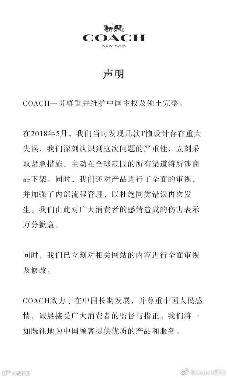 事件一出,蔻驰代言人刘雯在个人微博上发声明称,终止与该品牌的代言合同,并声明:任何时候,中国主权和领土完整不可侵犯!