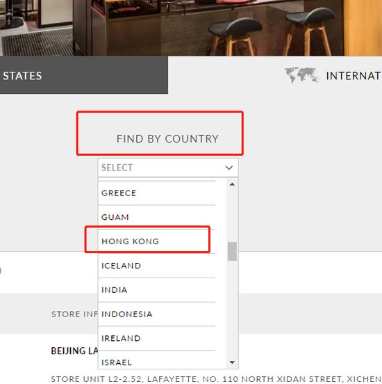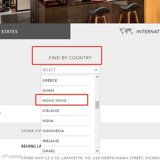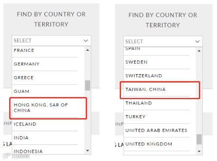 在蔻驰官网上搜索门店时,其显示为find by country(按国家查找),在下拉栏中赫然显示着香港、澳门和台湾三个地名,并与中国和美国等国家并列。