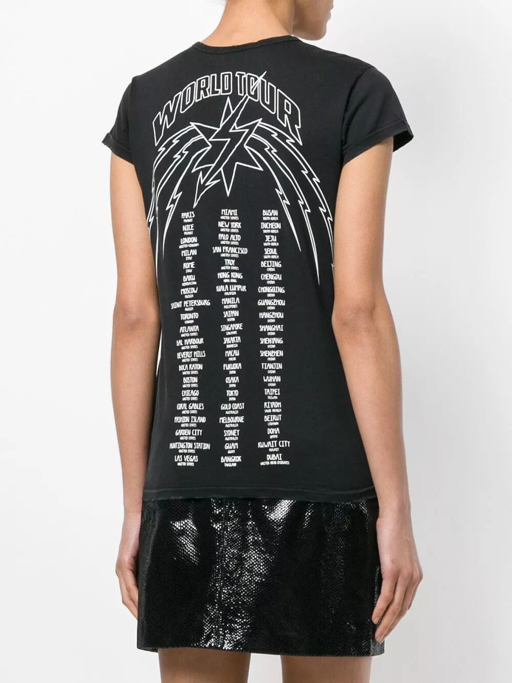 在纪梵希的一款黑色闪电T恤中,背面的图案印有多个城市和国家名称,其中北京、成都、杭州等中国城市后面都跟有中国,表示所属。