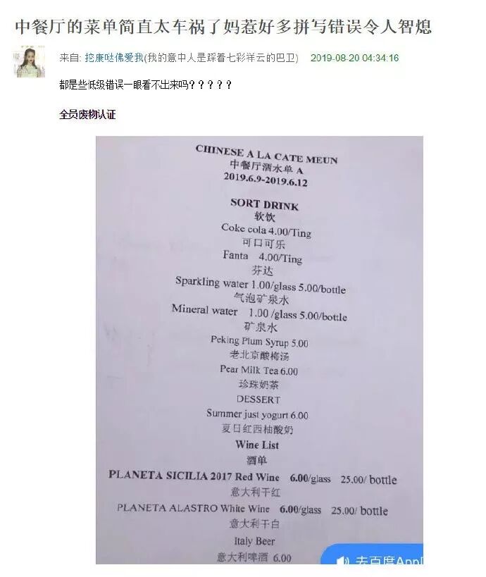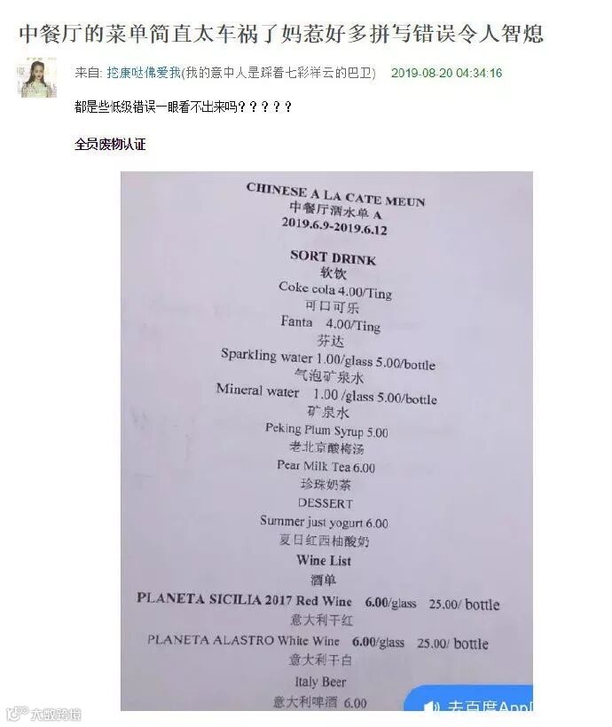 不过有点令人崩溃的是,这份菜单堪称大型翻车现场,几乎每一行都有错,有网友还发帖细细地整理出了每一处……