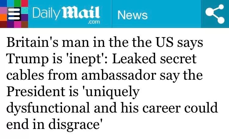 英国驻美大使称特朗普“无能”:英国驻美大使机密电报遭泄露,其中写到特朗普无能到堪称奇葩,其总统生涯或以耻辱告终
