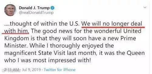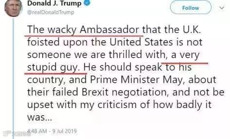 对于英国强加给美国的这位古怪大使,我们一点也不高兴,这是个愚蠢至极的人。他应该回国和特蕾莎·梅谈谈他们失败的脱欧谈判一事,而不是关心我怎样批评这件事……