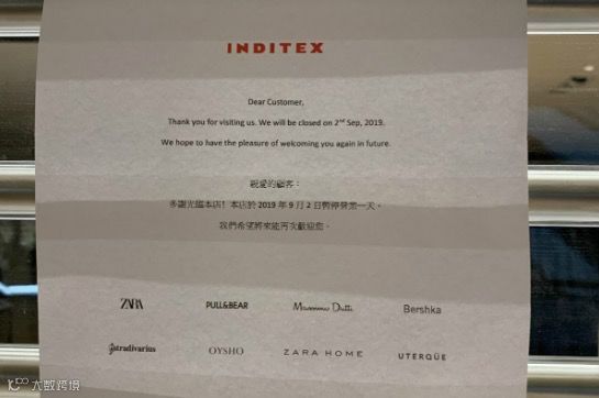 铜锣湾时代广场的Zara分店门外贴出告示称,2日暂停营业一天。