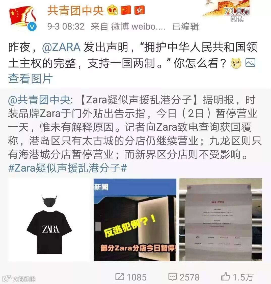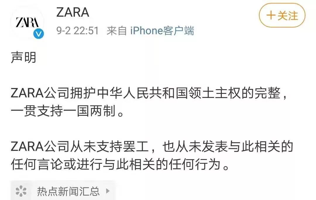 9月2日晚上22点51分,ZARA公司在其官方微博发布声明,表示公司拥护中华人民共和国领土主权的完整,一贯支持一国两制,并且称公司从未支持罢工,也未发布相关言论或进行相关的行为。