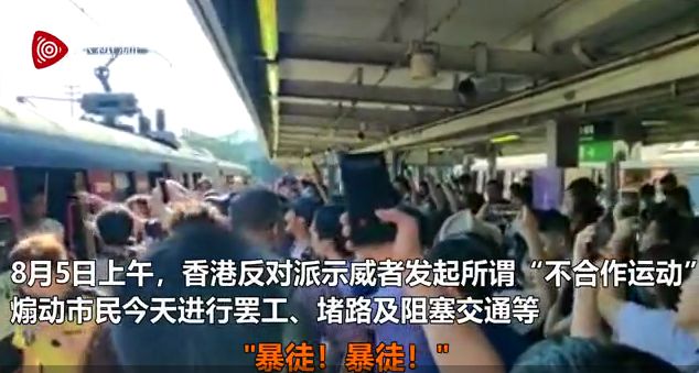 8月5日早上,香港示威者发起所谓“三罢”(罢工、罢课、罢市)行动以及“不合作运动”,在多个港铁站阻塞车门、瘫痪交通,造成多条港铁线路暂停服务,香港市民出行受阻。