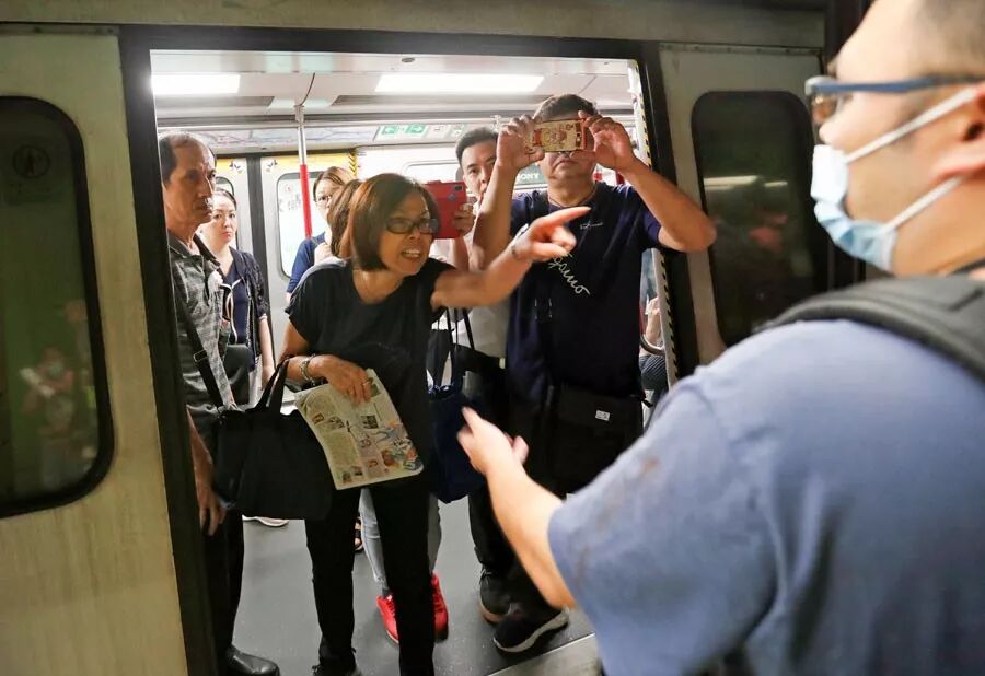 地铁炮台山站乘客怒斥示威者 图源:新华社