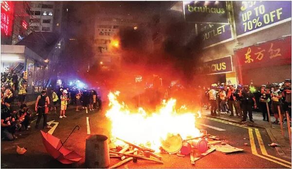 经过又一个周末的暴力抗议之后,香港5日再度陷入新的混乱。一场大罢工引发交通网络瘫痪,并导致大量航班被取消。