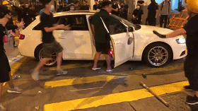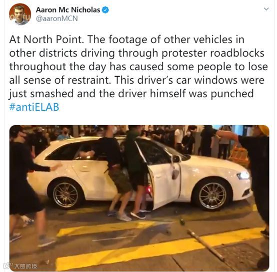 视频中,一个从其他区而来的男子驾车驶过北角,穿过抗议者在那里设置了一整天的路障,这让一些人行为失控。司机的车窗被砸烂,司机本人也被打。