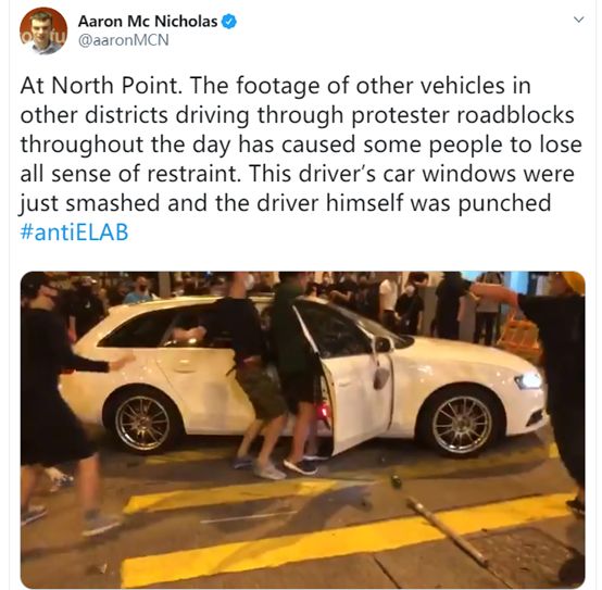 一名无辜的香港本地司机,在香港北角遭到一群黑衣暴徒的围堵,之后他的车子被挥舞着铁棍等凶器的暴徒砸坏,他本人也惨遭暴徒殴打。