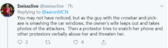 你们可能注意到了,那些带着撬棍和镐的男子正在打碎车窗,车主的妻子跳出来,拍下这一暴行,接着抗议者就试图抢她的手机,其他的抗议者则言语侮辱她的妻子,并威胁她。