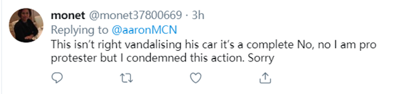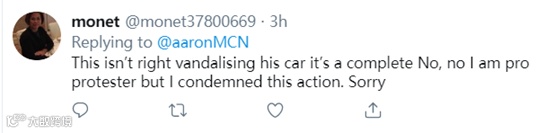破坏别人的车是不对的,绝对不行。我本来是支持这些抗议者的,但是做出这样的事情,恕我不能忍。