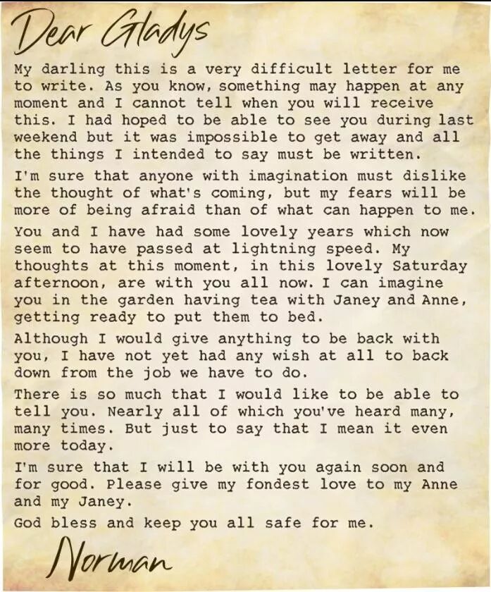 My darling, this is a very difficult letter for me to write. As you know, something may happen at any moment and I cannot tell when you will receive this. I had hoped to be able to see you during last weekend, but it was impossible to get away and all the things I intended to say must be written.