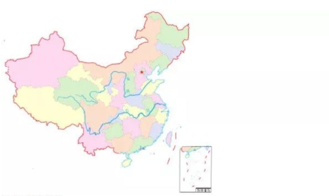 示意地图以南海诸岛作为附图的形式表示,分省设色,标明了国界、省界、海岸线、首都、省级行政中心、长江和黄河。