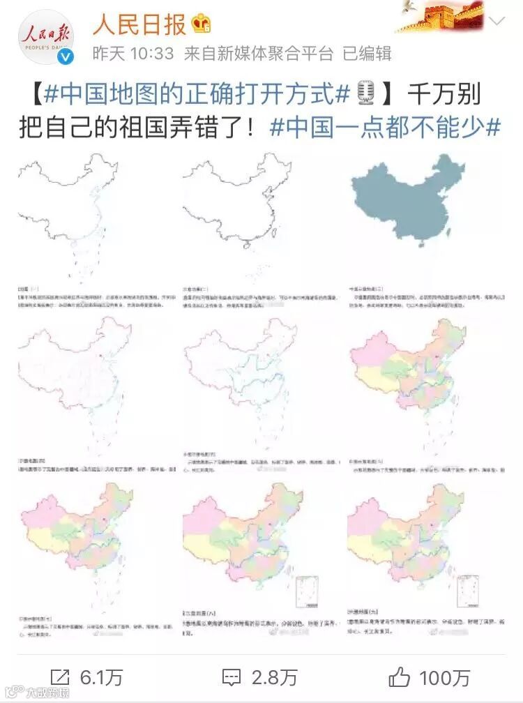 包括人民日报在内的官方媒体在微博上贴出了正确的中国地图,并带上话题“中国地图的正确打开方式”,呼吁人们更好地了解中国的领土。