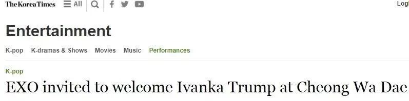 韩国时报网站:EXO受邀在青瓦台欢迎伊万卡