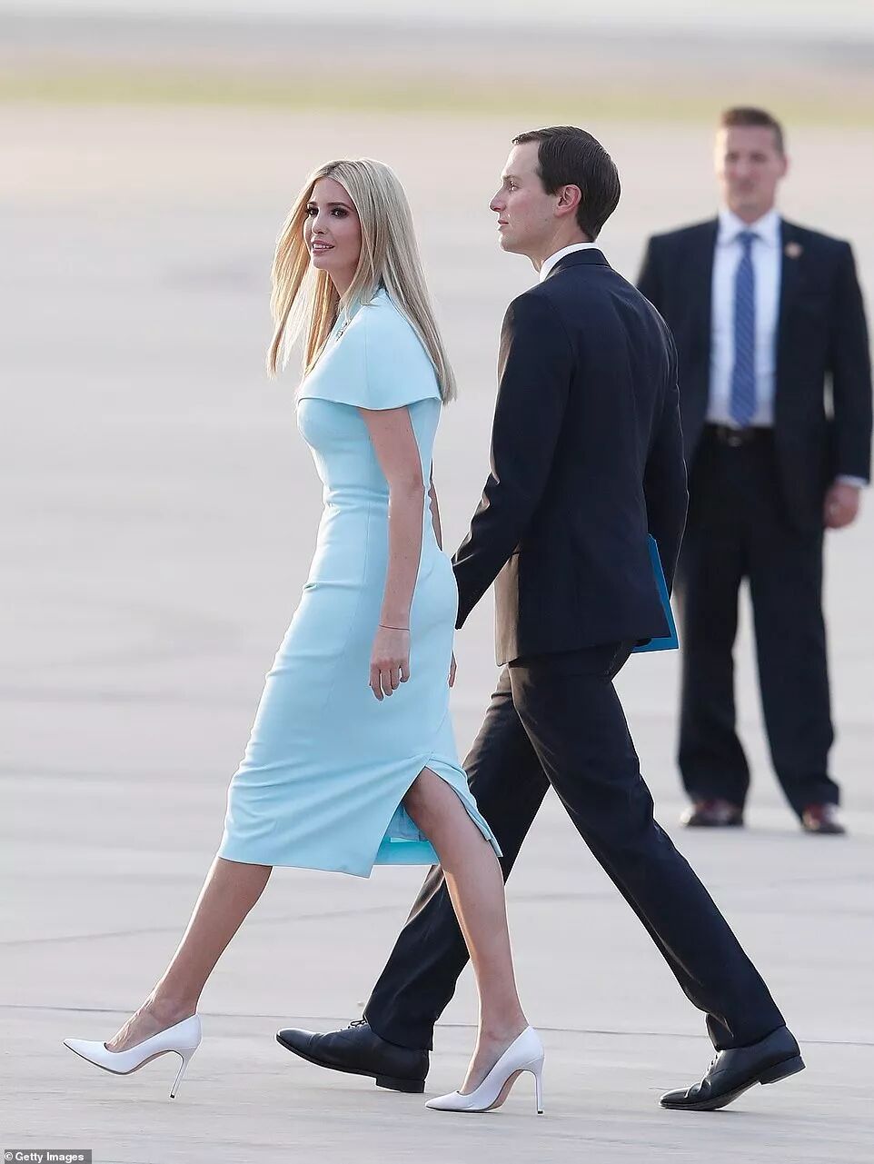 当天伊万卡身穿一件淡蓝色西装裙显得格外清爽。