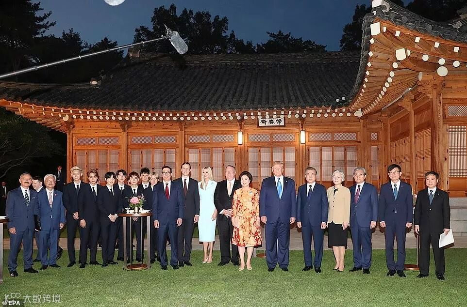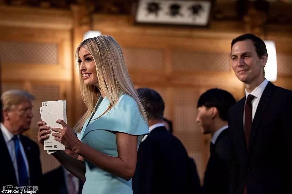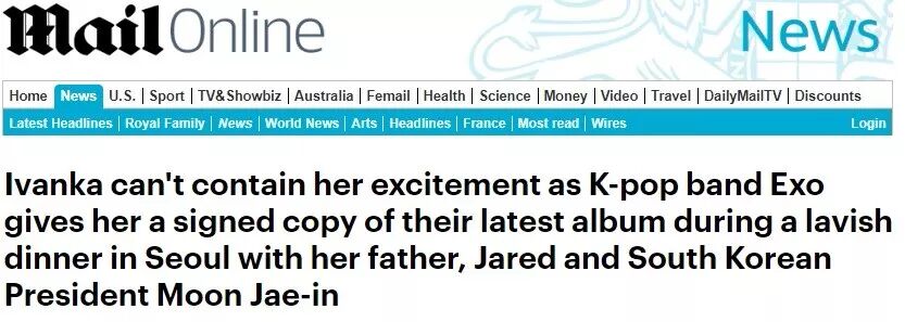 英国《每日邮报》网站:随父亲特朗普,丈夫贾里德与韩国总统文在寅共进丰盛晚宴,伊万卡收到韩国男团EXO最新签名专辑,难掩内心激动