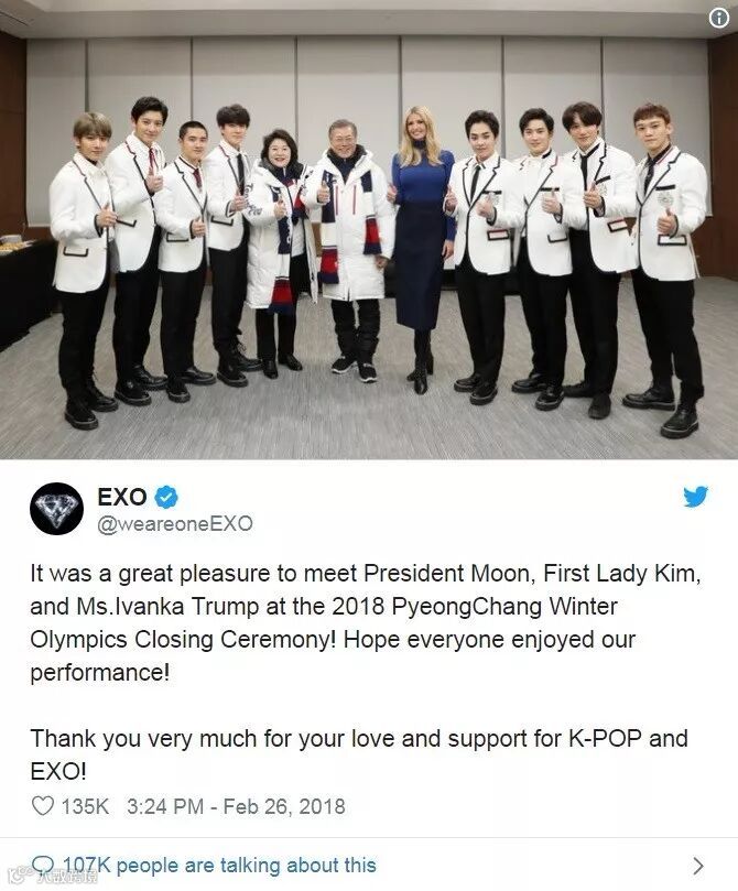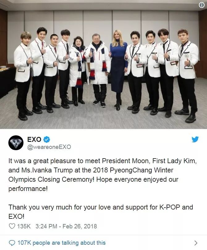 要说EXO与伊万卡的确在平昌冬奥会有这样一段渊源。当时EXO还发推表示很荣幸见到她,感谢大家对韩国流行音乐和EXO的喜爱支持。