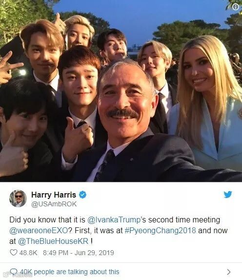 美国驻韩大使哈里斯当天发推称,这已经是伊万卡第二次与EXO见面了。“上次是在2018年平昌冬奥会上,这次是在青瓦台。”