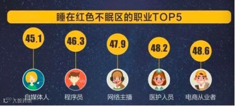 睡在红色不眠区的职业top5分别为:自媒体人 (content creator)、程序员(programmer)、网络主播 (live streamer)、医护人员 (doctor and nurse)、电商从业者(e-commerce staff)。