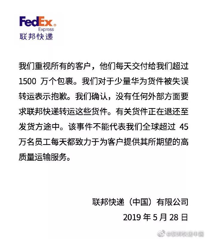 “对少量华为货件被失误转运表示抱歉”,并表示“没有任何外部方面要求联邦快递转运这些货件”。