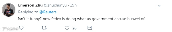 批评人事表示,美国媒体在对联邦快递和对华为这两家公司上体现了双重标准,目前华为正在美国商务部的贸易黑名单上。